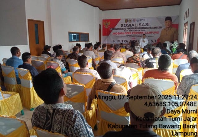 Axelerasi – Tulangbawang Barat, 7 September 2025 – Anggota DPRD Provinsi Lampung, Putra Jaya Umar, menegaskan bahwa narkoba merupakan ancaman serius bagi masa depan bangsa. Dalam sosialisasi pembinaan ideologi Pancasila dan wawasan kebangsaan di Kabupaten Tulangbawang Barat, ia menyatakan bahwa narkoba lebih berbahaya daripada terorisme karena merusak moral dan menghancurkan generasi muda.