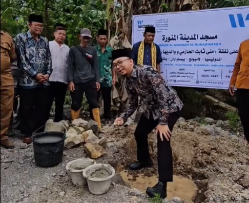 Axelerasi.id – Anggota DPRD Provinsi Lampung, Syukron Muchtar, menghadiri kegiatan peletakan batu pertama pembangunan Masjid Al Madina Al Munawwaroh yang digelar oleh WAMY Indonesia (World Assembly of Muslim Youth) di Desa Hanura, Kecamatan Teluk Pandan, Kabupaten Pesawaran, Senin (13/10/2025).